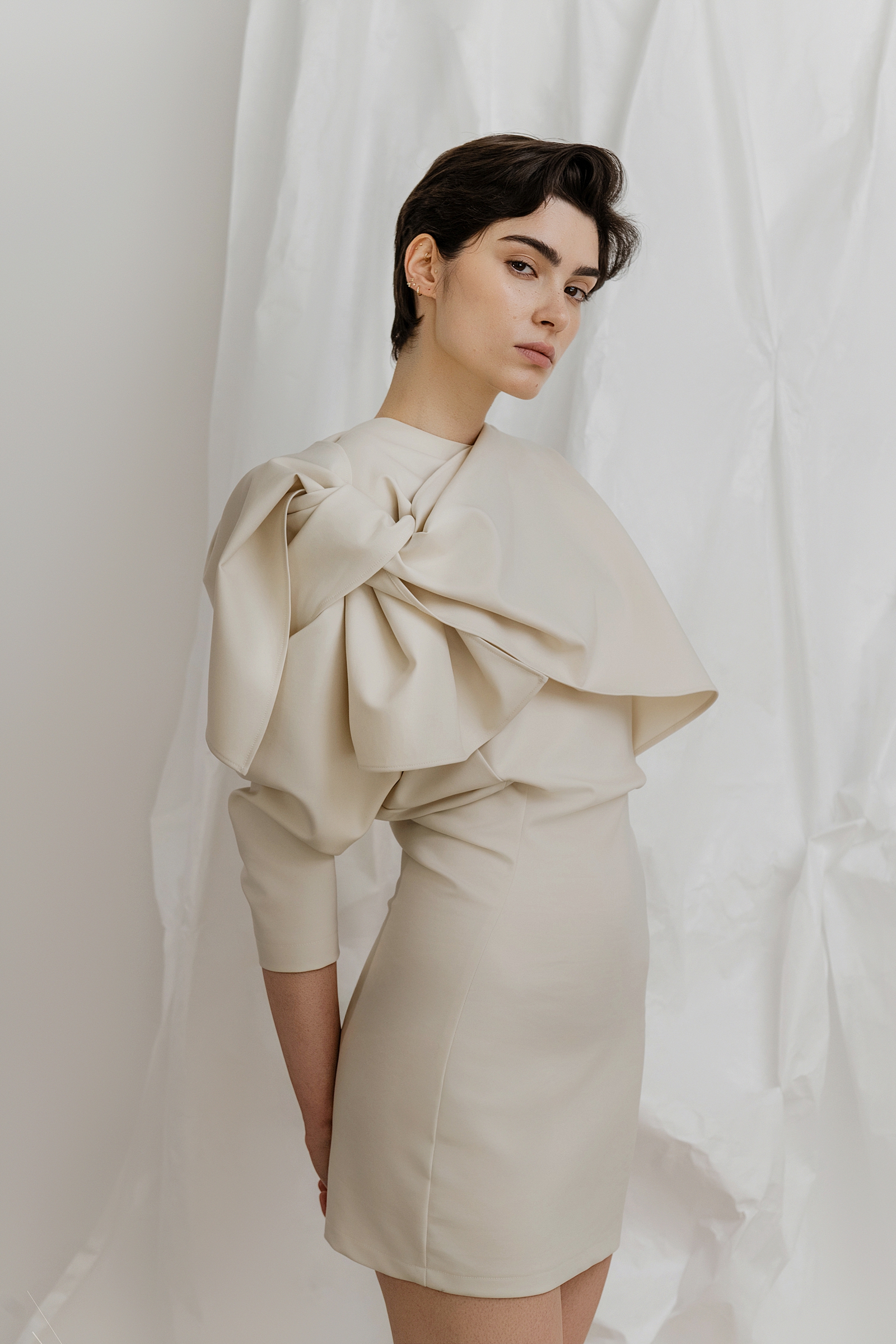 Posebna pažnja posvećena je odabiru materijala, gdje svaka tkanina nosi svoju ulogu u jeziku kolekcije. Svila se ističe preciznim padom i prirodnom lakoćom, nježno se prilagođavajući tijelu. Cupro, kao regenerirana celuloza, suptilno reagira na svjetlo mijenjajući svoj karakter s pokretom i promjenom ambijenta. Brušeni pamuk donosi taktilnu dimenziju: mekan, gotovo baršunast na dodir, s osjećajem koji nadilazi vizualni dojam. Prirodne i lepršave tkanine naglašavaju pokret i ugodu nošenja, oblikujući komade koji djeluju lako, ali s jasnom namjerom odražavajući ženstvenost koja je istovremeno prizemljena i izražajna, smirena i samouvjerena.